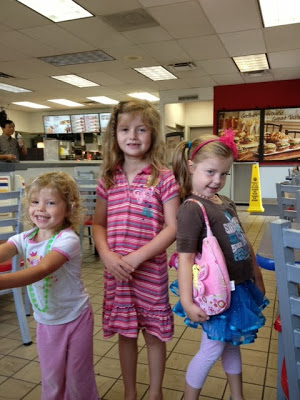 We are staying in a hotel, which the girls love, and this morning we all rolled out of bed and decided to get breakfast. We were up for maybe five or ten minutes before heading out the door. Yet when we got to Burger King (which was selling Cinnabon–the ultimate breakfast selling point) I noticed that Viva looked a little bit different than her sisters.