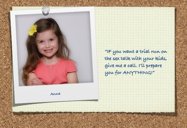 2) I believe it's much better to just be open and honest with kids and not act embarrassed. Just take the stigma away. It's really sad that so many parents can't get past their own embarrassment to talk about sex so they leave it to schools to do it and then they get in a hissy because they can't agree on what to have the schools say. I learned about sex at a young age. Probably younger than Anna. My cousin told me to ask my mom- probably because she thought it would be funny to make her squirm. Well she didn't. Just told me what was what. She drew diagrams and everything. And I turned out to be a completely GREAT and well adjusted adult! (Okay. Maybe that's up for debate.)